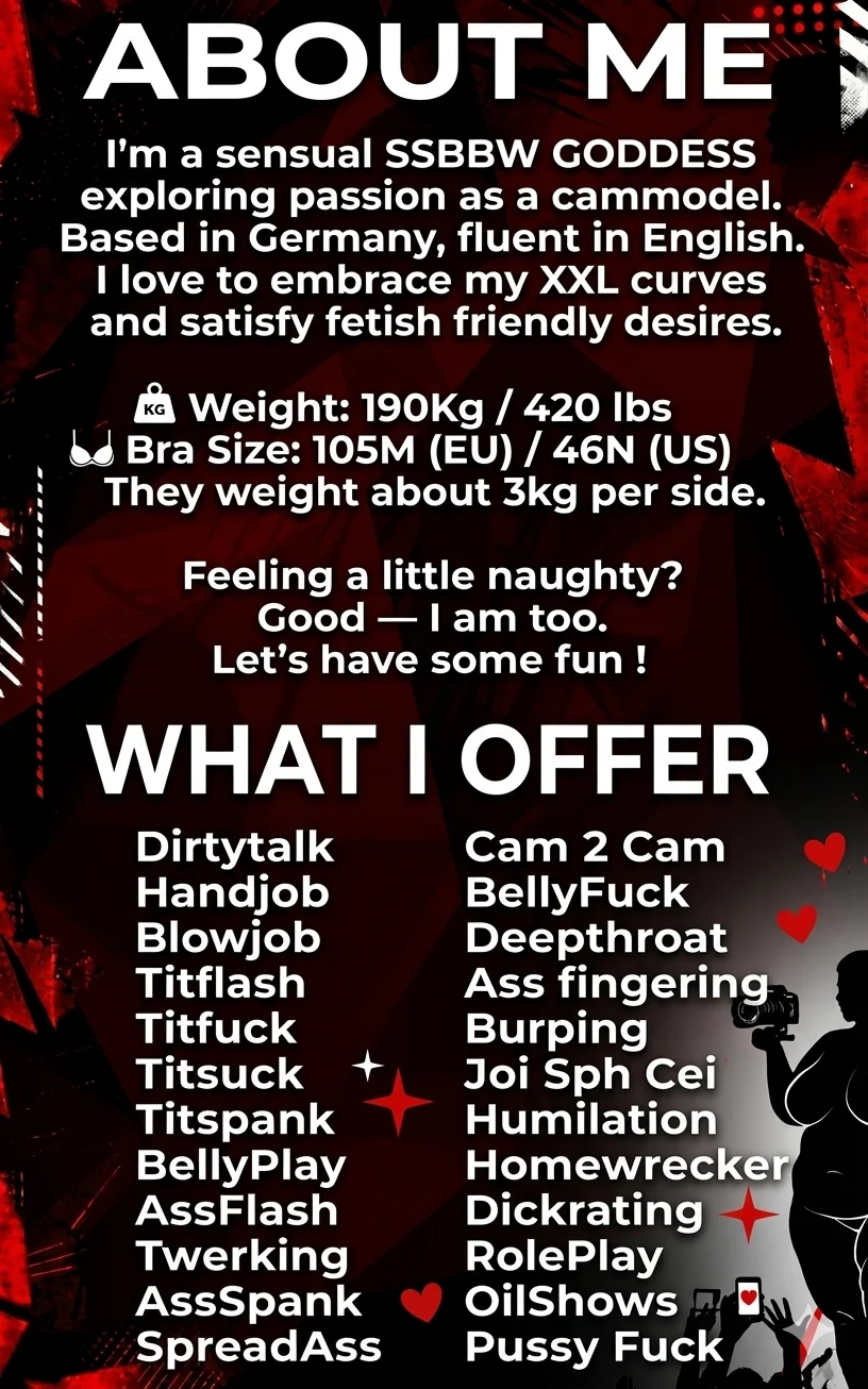 تعري, صدر عارٍ, مص, كلام بذئ, وضعية الكلب, مداعبة يدوية, تدليك, صفع, نيك الصدر, رقص التويرك, Burping, SPH, CEI, لعب الأدوار, عرض زيت, عاشقات, تعليمات الاستمناء, إهانة, بلع حتى الرغبة في القيء, جلوس على الوجه, رقص مثير, حلق عميق, تقييم الزبر